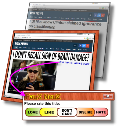 Sick of not being able to find “true” unbias news? Fake News? Realize that the current news and media outlets are polarized, but want unfiltered, non-spun news? Others provide lies through Fake News. FAUX NEUZ is the solution. FAUX NEUZ’s patented (US and International Patent Pending) process provides a unique news experience. Stop wasting your browsing time, the brainwashing, the lies, and try honest “Veneer Free News” from FAUX NEUZ.FAUX NEUZ? FAUX NEUZ is a FREE online service that allows users to alter the titles of news stories from a wide variety of sources, including CNN, Fox News, MSNBC, The Wall Street Journel, The NY Post, Yahoo News, USA Today, TMZ, and hundred of others.* In addition to changing titles, users can also rate other’s alternate titles, view most and least popular titles, and share their titles with others. Please watch the YOUTUBE video below to see an overview of FAUX NEUZ.To streamline the experience, FAUX NEUZ can be set to present alternate titles over existing websites, so they are automatically viewable when a member visits their favorite news or media website, as illustrated below. Or members can view stories from our website, or have FAUX NEUZ texted** or emailed** to their preferred device (phone, tablet, desktop, and etc.). FAUX NEUZ - The largest open socio-political experiment in the world. * FAUX NEUZ is not owned or affiliated with CNN, Fox News, MSNBC, The Wall Street Journel, The NY Post, Yahoo News, USA Today, TMZ, or any other media outlet mentioned herein. Additionally, FAUZ NEUZ only shares generic de-identified information with members, does not sell or share member identifiable information to external entities, and we do not have any relationship with any of these news and media outlets.